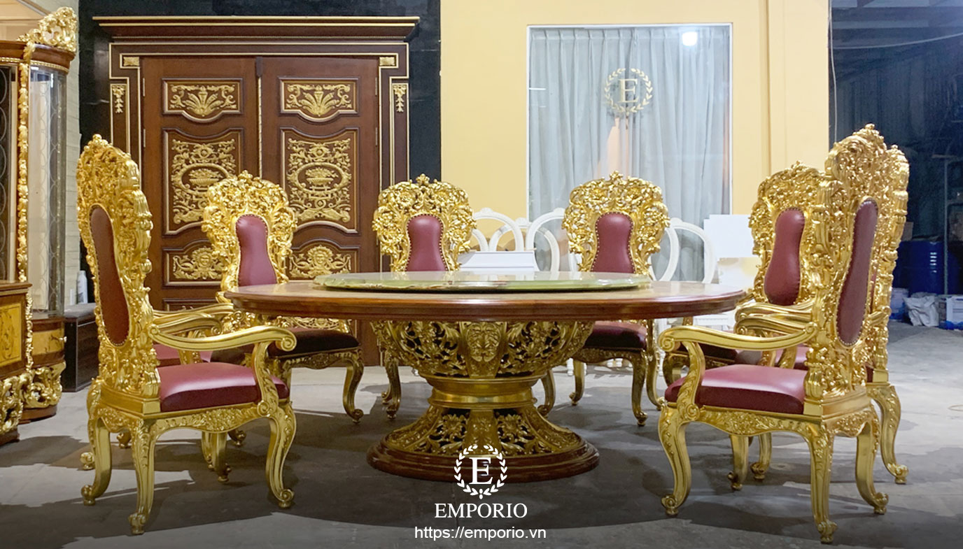 Với vẻ đẹp xa hoa và phong thái vương giả, bàn ăn dát vàng là lựa chọn lý tưởng cho các căn biệt thự, lâu đài hay những không gian nội thất tân cổ điển cao cấp. Đây không chỉ là bàn ăn, mà còn là tuyên ngôn phong cách sống đẳng cấp và khác biệt.
