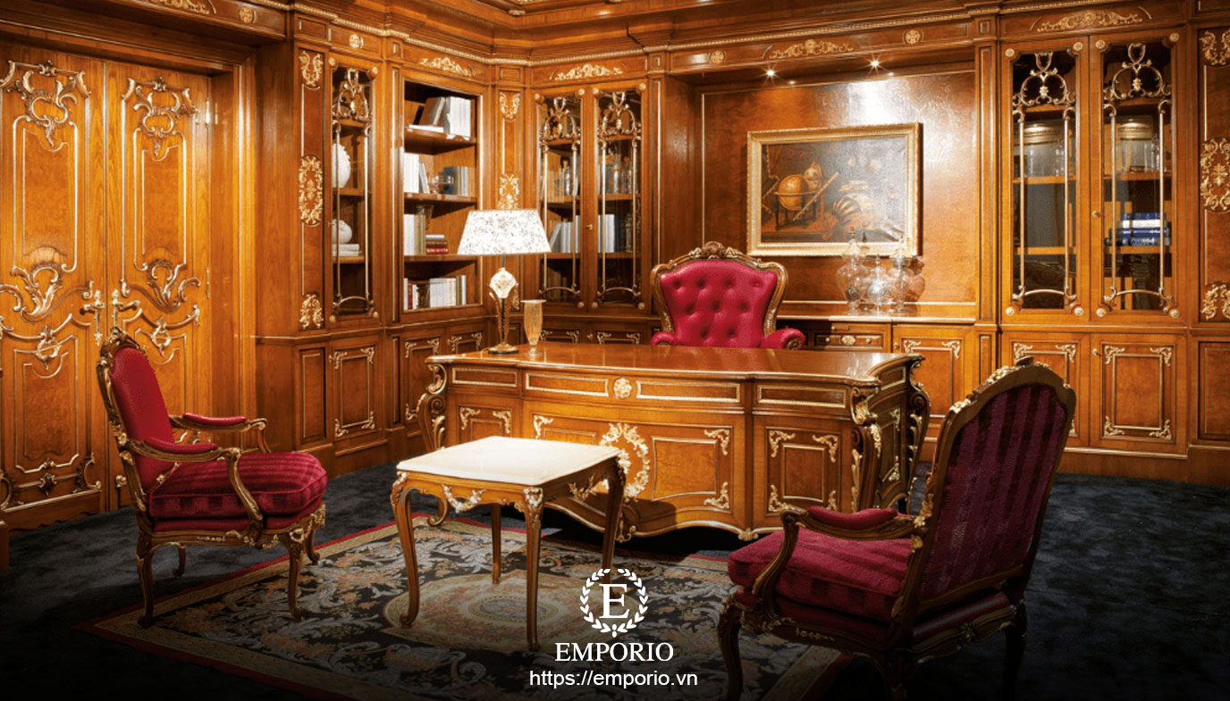 Màu gỗ tự nhiên được phối hợp với lớp dát vàng tinh tế, tạo nên vẻ đẹp vừa cổ điển, vừa hiện đại. Màu gỗ đem lại cảm giác gần gũi, ấm cúng, trong khi lớp dát vàng mang đến sự lấp lánh, sang trọng, phản chiếu ánh sáng, tạo điểm nhấn nổi bật cho không gian làm việc.