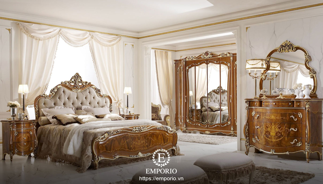Với thiết kế chuẩn mực phong cách cổ điển, giường ngủ màu gỗ dát vàng phù hợp đặt tại phòng ngủ master, biệt thự, villa cao cấp hay các không gian khách sạn hạng sang. Đây là lựa chọn lý tưởng để nâng tầm không gian sống và thể hiện phong cách sống thượng lưu.