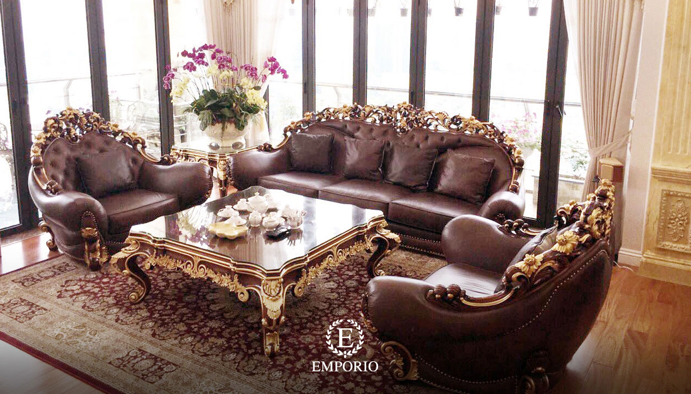 Trong nghệ thuật thiết kế nội thất, sofa chính là điểm nhấn khẳng định gu thẩm mỹ và vị thế của gia chủ. Sofa cổ điển bọc da nâu dát vàng không chỉ mang đến sự tiện nghi mà còn gợi lên cảm giác quyền quý, xa hoa, chuẩn phong cách hoàng gia châu Âu.