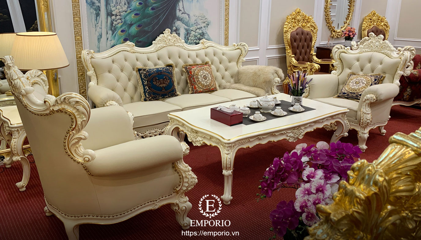 Sofa cổ điển hoàng gia màu trắng kem không chỉ là nội thất sang trọng mà còn là biểu tượng của đẳng cấp và gu thẩm mỹ tinh tế. Đây là sự lựa chọn lý tưởng để tôn vinh không gian sống của bạn, từ biệt thự cao cấp đến khách sạn 5 sao.